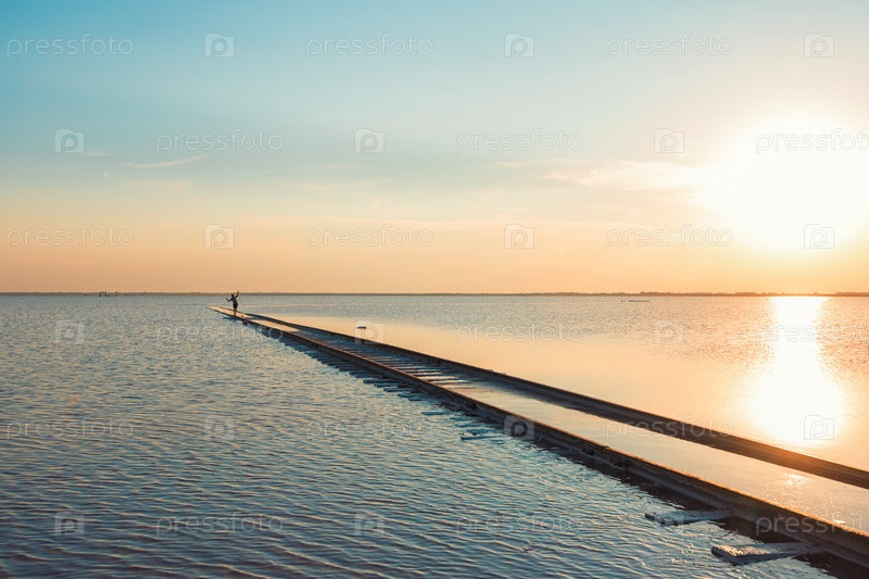 Мальчик идет по железной дороге в соленом озере. Красивый закат на соленом озере в Алтае, Сибирь, Россия
