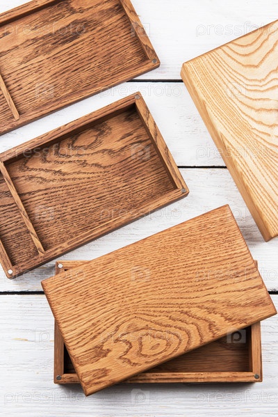Деревянная фотокоробка для хранения фотографий на деревянном белом фоне