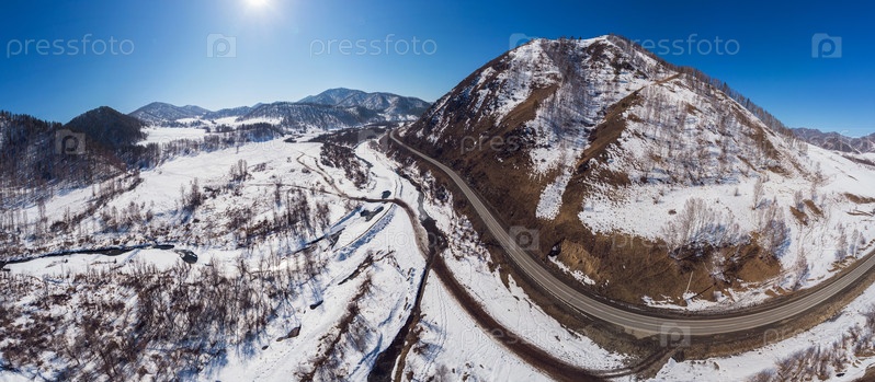 Вид с воздуха на дорогу в зимнем пейзаже Алтайских гор