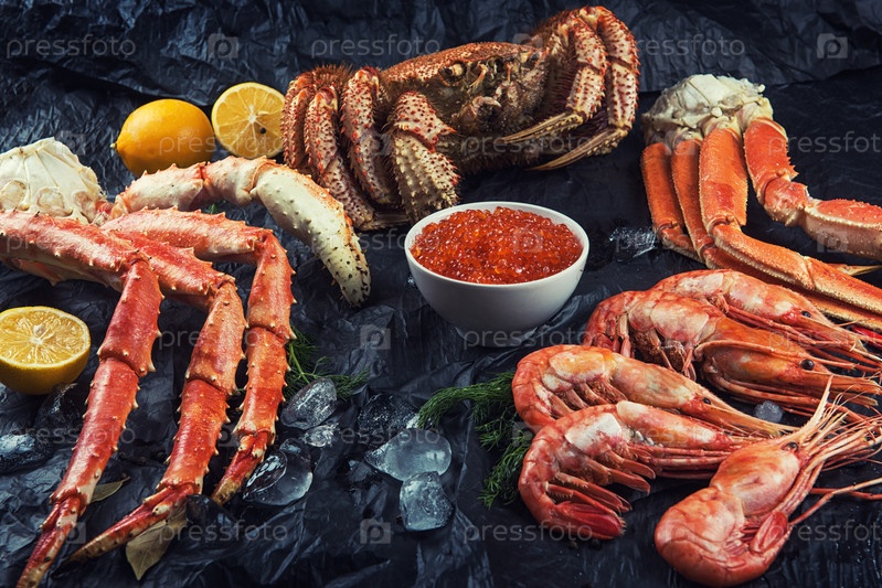 Набор морепродуктов: красная и черная икра, конечность волосатого краба, конечность краба-стригуна, дальневосточный камчатский краб