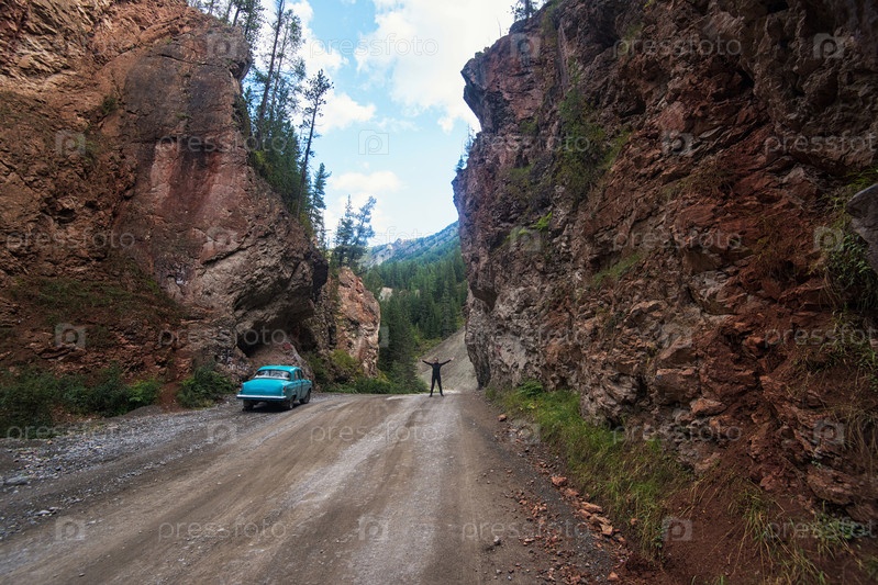Женщина и автомобиль на дороге пробиты камнями в горах Алтая, Сибирь, Россия