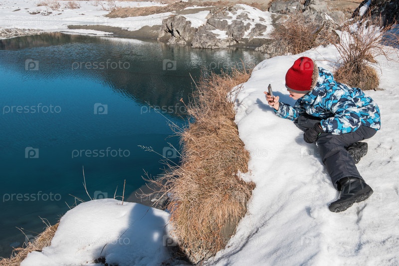 Молодой мальчик фотографирует на берегу реки в прекрасный солнечный весенний день, в горах Алтая. Концепция путешествия и отпуска