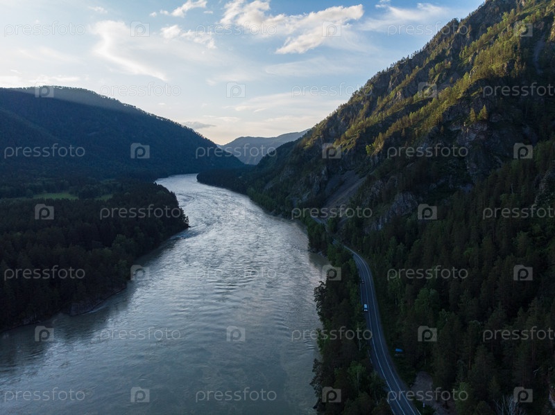 Вид с воздуха на реку Катунь с дорогой после захода солнца в горах Алтая