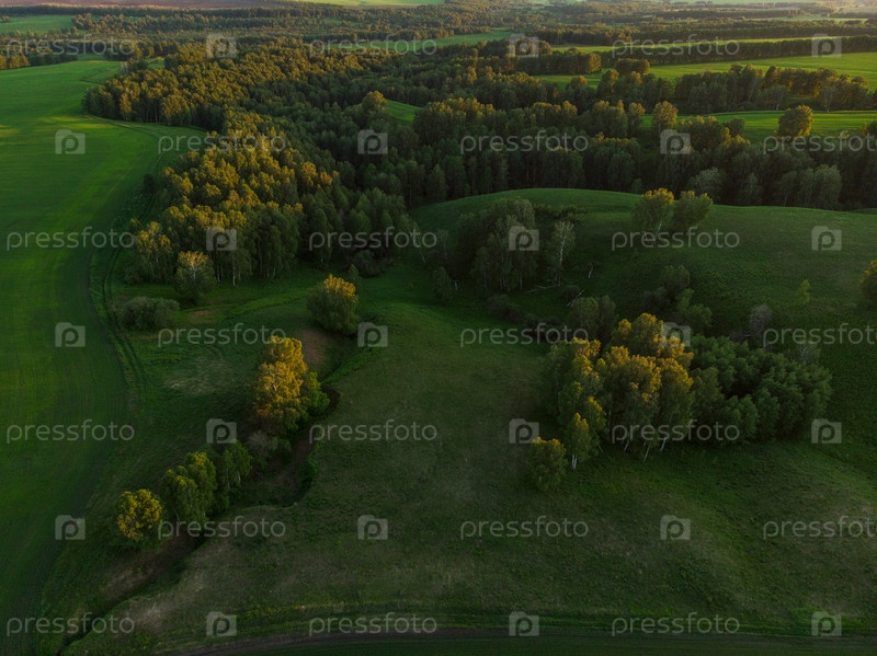 Вид сверху на зеленые поля и луга в вечернее лето. Пейзаж с дроном на Алтае