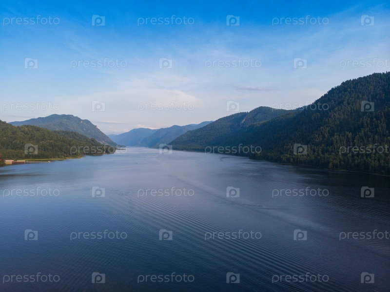 Вид с воздуха на Телецкое озеро в горах Алтая, Сибирь, Россия. Снято с дрона. Красота летнего дня