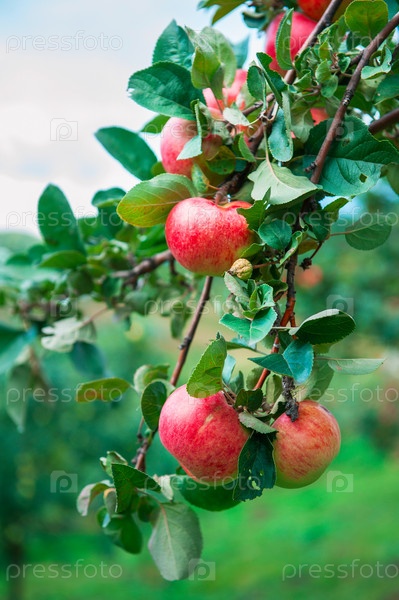 Яблоня с яблоками, органические натуральные фрукты в саду, концепция сбора урожая