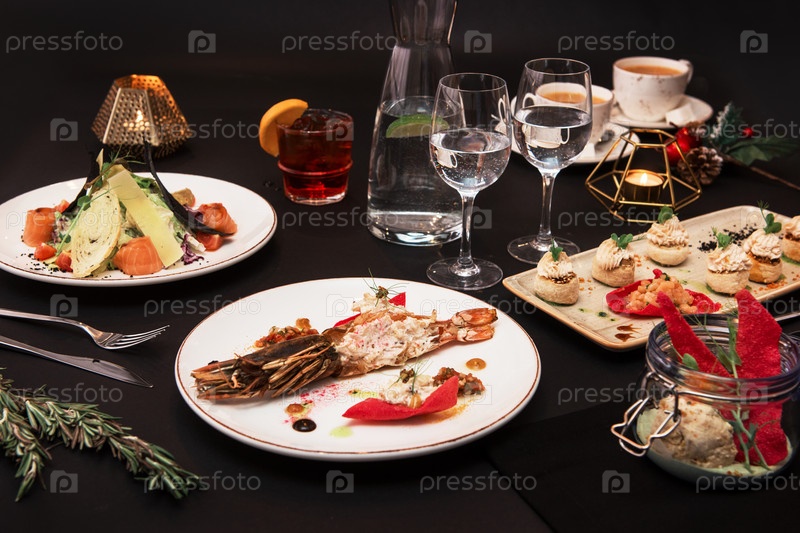 Вкусные блюда ресторана: вареные и фаршированные раки, салат, закуски и мороженое из раков