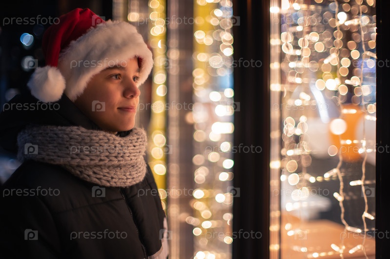 Мальчик в шапке Санты смотрит и мечтает в освещенной витрине магазина. Рождественские подарки, праздники или покупки на Новый год или Рождество концепции