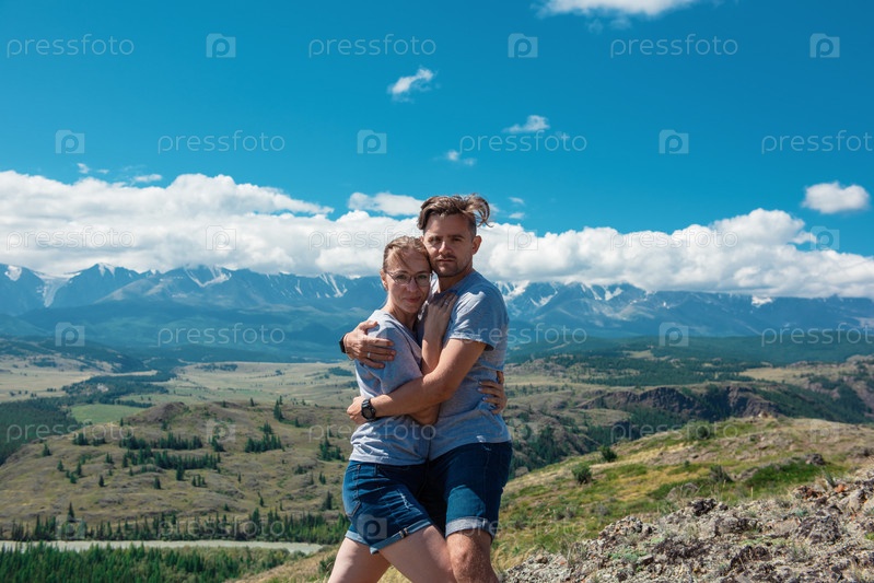 Влюбленная пара вместе на Алтайских горах, любуясь видом