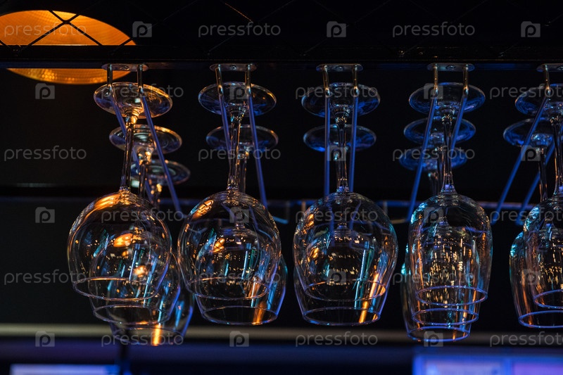Пустые чистые бокалы для вина над барной стойкой