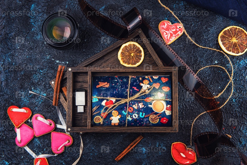 Деревянная фотокоробка с фотографией на День святого Валентина или День свадьбы. Украшена пряниками. Романтическая или любовная концепция. Пряники на День святого Валентина на темном бетонном фоне