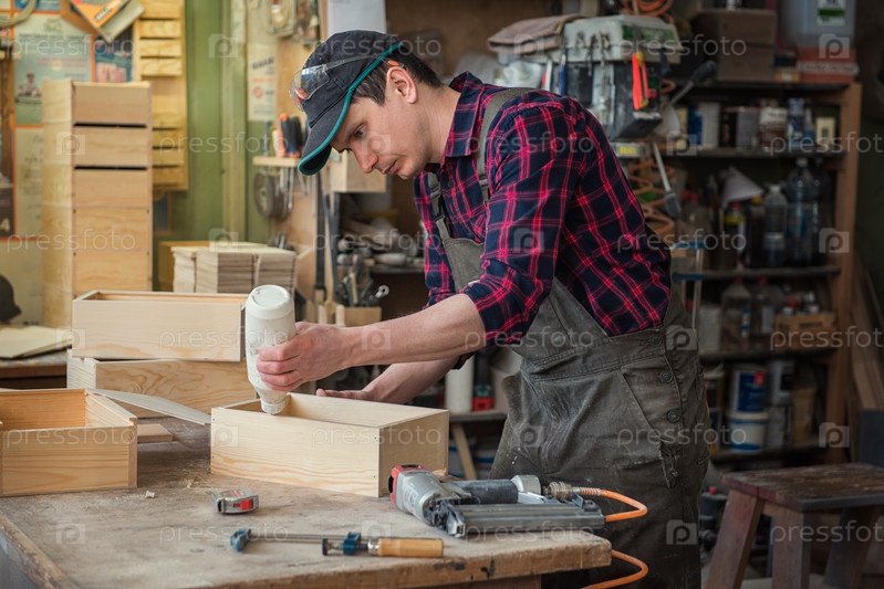 Рабочий, изготавливающий деревянную коробку. Профессия, плотницкое дело и столярное дело