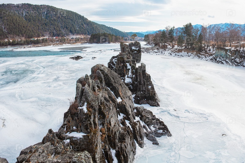 Быстрая горная река Катунь на Алтае, Сибирь, Россия. Популярное туристическое место, называемое Зубы Дракона. Красота солнечного зимнего дня