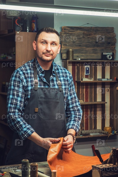 Мужчина, работающий с кожаным текстилем в мастерской. Мужской портрет. Концепция ручного ремесленного производства кожаных изделий