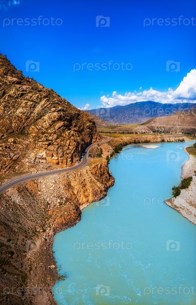 Вертикальное фото дороги в горах Алтая. Чуйский тракт в Республике Алтай, Сибирь, Россия