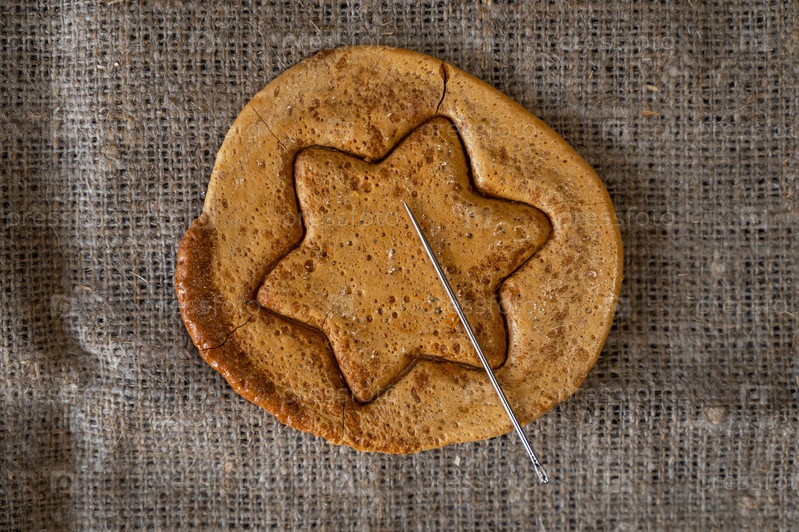 Печенье из коричневого сахара с карамелью и металлической иглой в форме звезды. Концепция игры на выживание