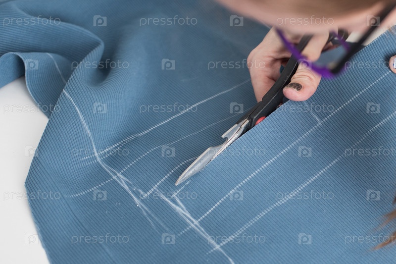 Женщина-портниха режет ткань ножницами