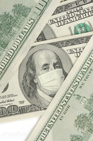 Портрет Франклина на 100-долларовой банкноте с медицинской маской. Концепция эпидемии коронавриуса и финансовый кризис, вызванный этим крахом