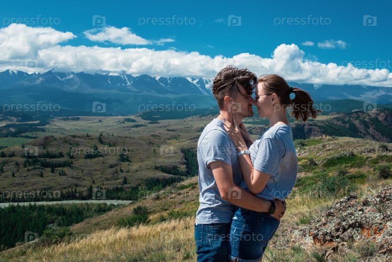 Влюбленная пара вместе на Алтайских горах, любуясь видом