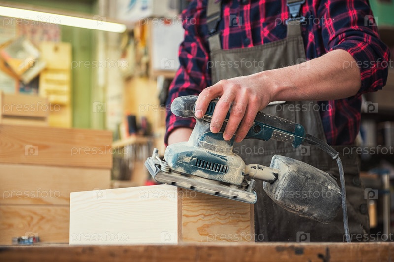 Рабочий шлифует деревянную коробку угловой шлифовальной машины. Профессия, плотницкое дело и столярная концепция