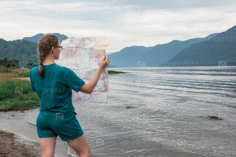 Женщина с картой на Телецком озере в горах Алтая, Сибирь, Россия