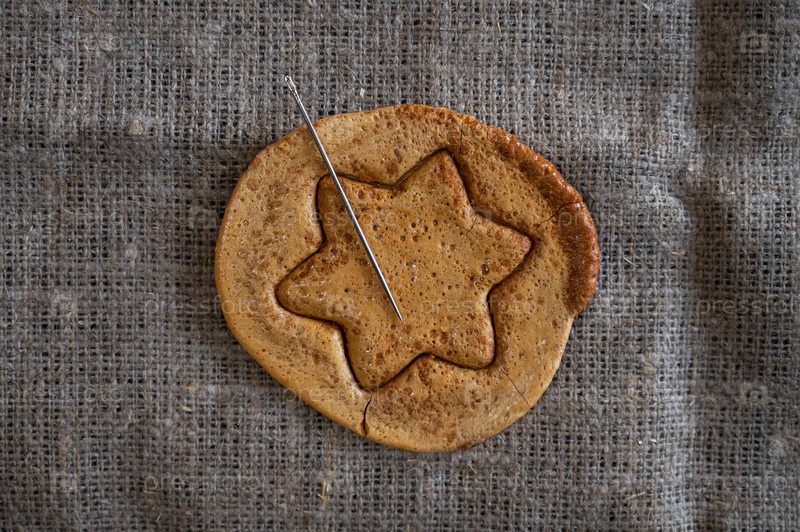 Печенье из коричневого сахара с карамелью и металлической иглой в форме звезды. Концепция игры на выживание