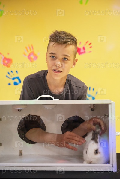 Игра в слепую догадку на ощупь. Мальчик догадывается на ощупь, что он не видит в коробке, кролик в коробке. С днем рождения, празднование или игры с друзьями концепция