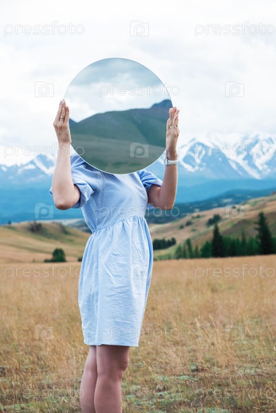 Человек стоит в летних горах Алтая в Курайской степи и держит круглое зеркало. Творческая концепция путешествия