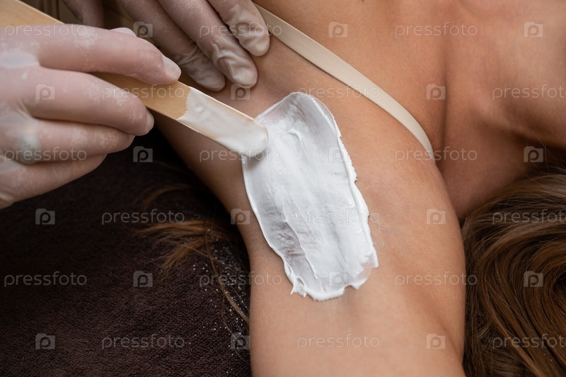 Косметолог в клинике красоты проводит процедуру эпиляции для удаления волос из подмышек с использованием белой пасты для шугаринга. Концепция красоты и ухода за телом