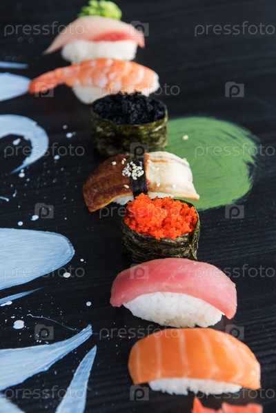 Различные виды суши подаются на деревянном черном столе