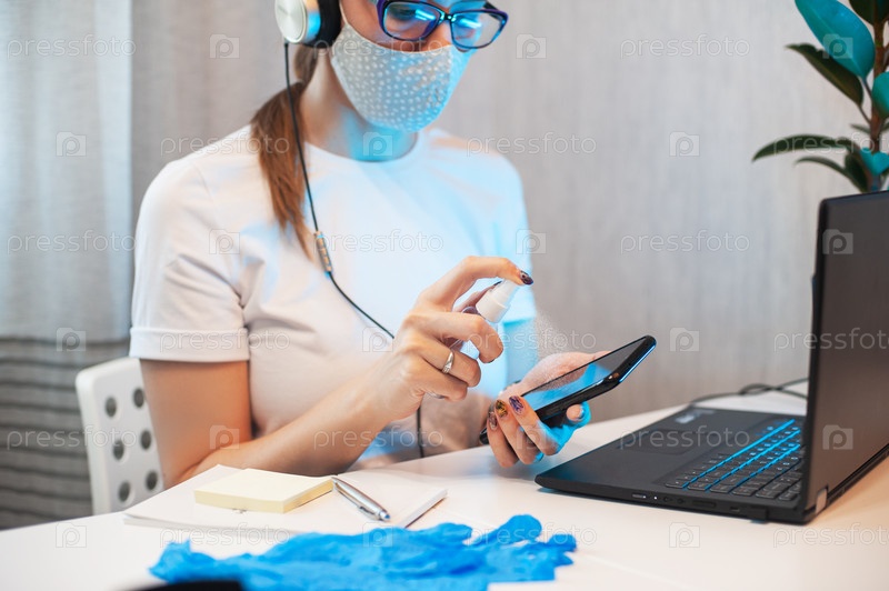 Женщина дезинфицирует поверхность телефона