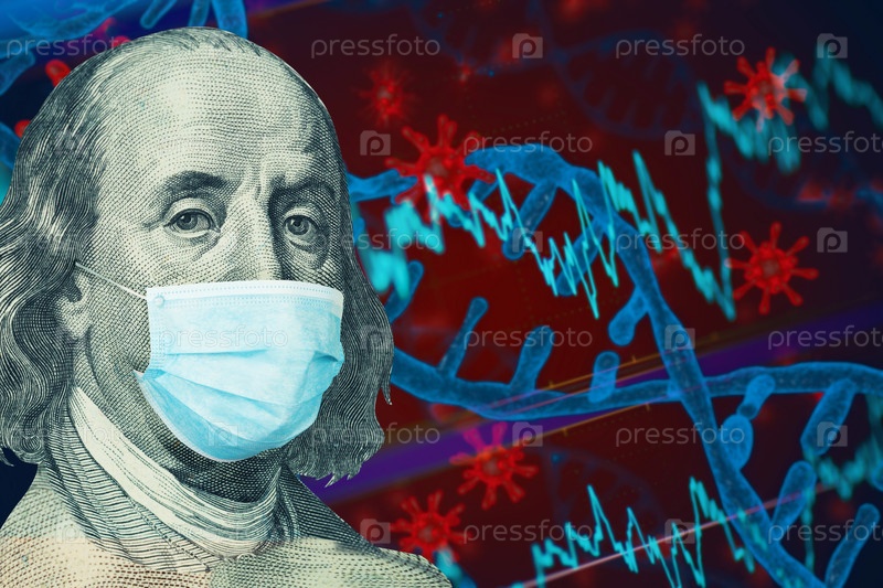 Бенджамин Бен Франклин изолировал лицо от 100-долларовой банкноты с маской на фоне ковида. Концепция мирового финансового кризиса и пандемии