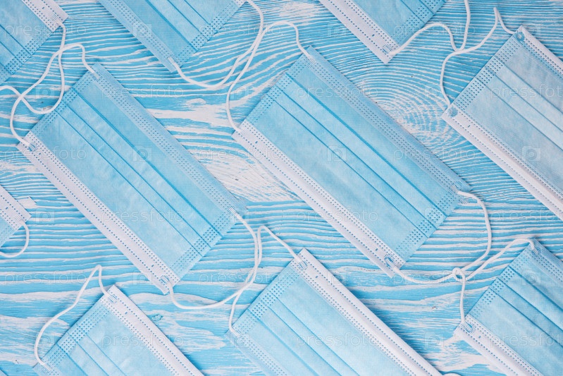 Медицинские маски на синем фоне для защиты от коронавируса. Концепция эпидемии и здравоохранения, узор, плоская планировка