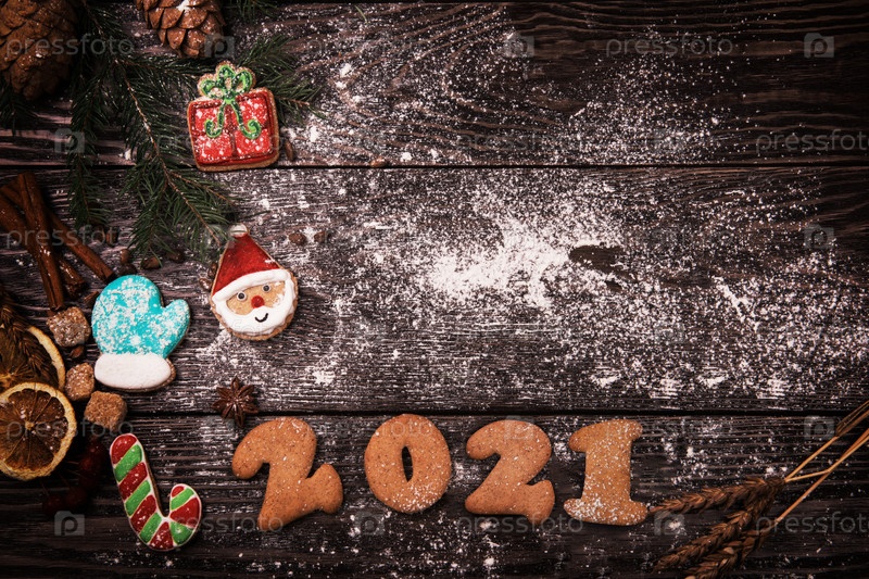Концепция Нового года 2021: праздничные пряники на деревянном фоне, рождественская тематика