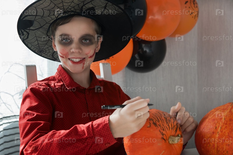 Счастливый подросток в костюме готовится к празднованию Хэллоуина, рисуя тыкву. Концепция карнавала или маскарада на Хэллоуин