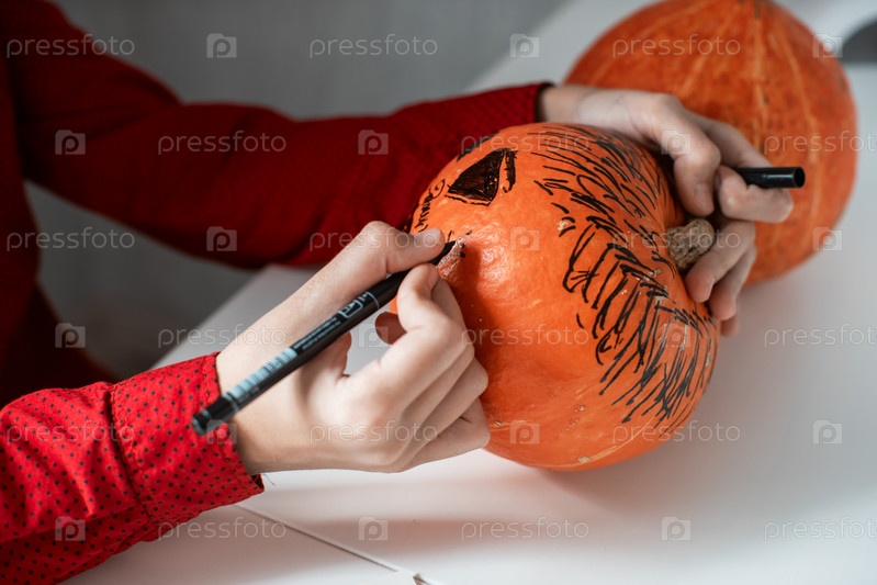 Счастливый подросток в костюме готовится к празднованию Хэллоуина, рисуя тыкву. Концепция карнавала или маскарада на Хэллоуин