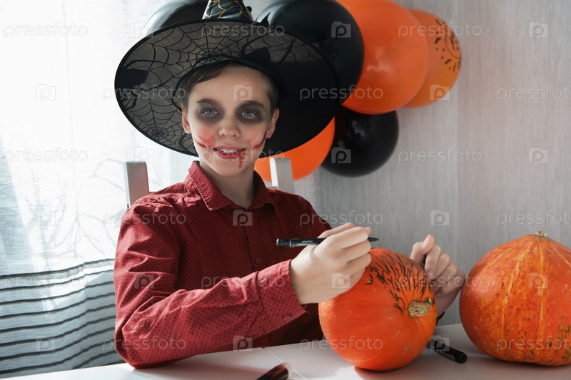 Счастливый подросток в костюме готовится к празднованию Хэллоуина, рисуя тыкву. Концепция карнавала или маскарада на Хэллоуин