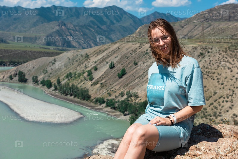 Внутренний туризм, путешествия, отдых и концепция свободы: женщина на слиянии двух рек Катуни и Чуи в горах Алтая, красота летнего дня