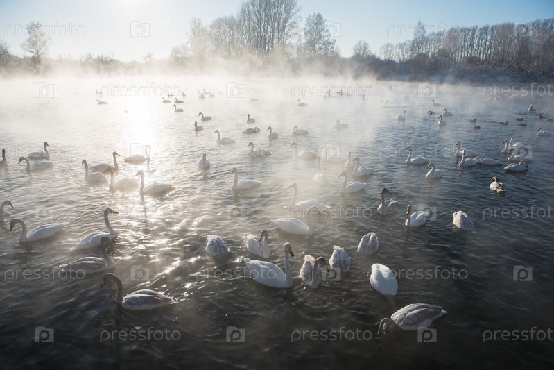 Красивые белые лебеди-кликуны плавают в незамерзающем зимнем озере. Место зимовки лебедей, Алтай, Сибирь, Россия