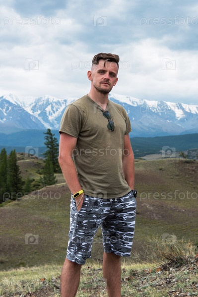 Отдыхающий мужчина в Курайской степи на фоне Северо-Чуйского хребта. Алтайские горы, Россия