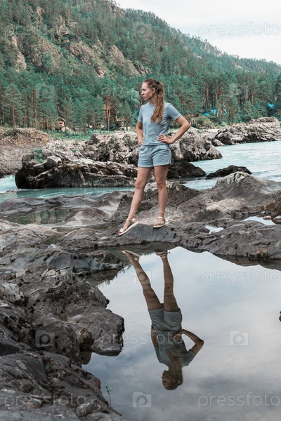 Женщина у реки на территории Алтайских гор