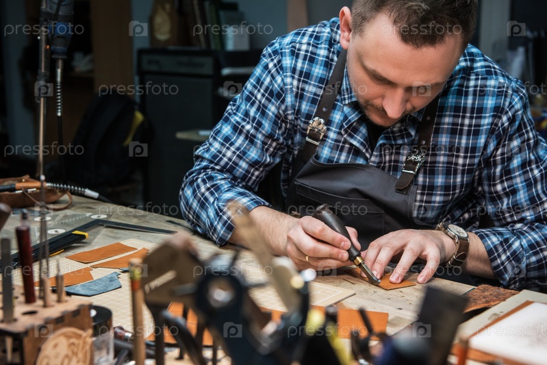 Мужчина работает с кожаным текстилем в мастерской. Концепция ручного ремесленного производства кожаных изделий