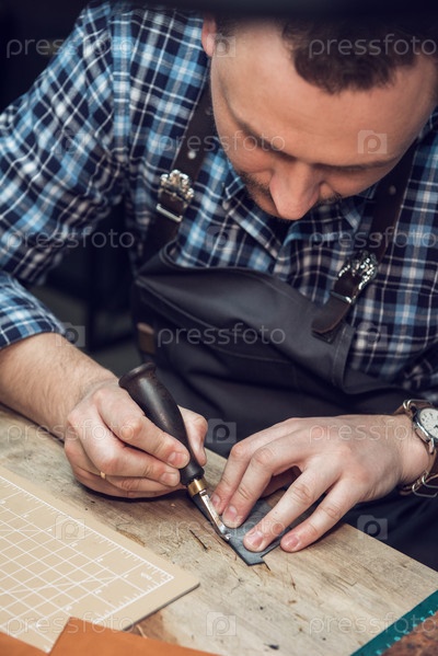 Мужчина работает с кожаным текстилем в мастерской. Концепция ручного ремесленного производства кожаных изделий