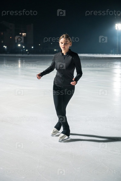 Красивая молодая женщина катается на коньках и исполняет короткую программу