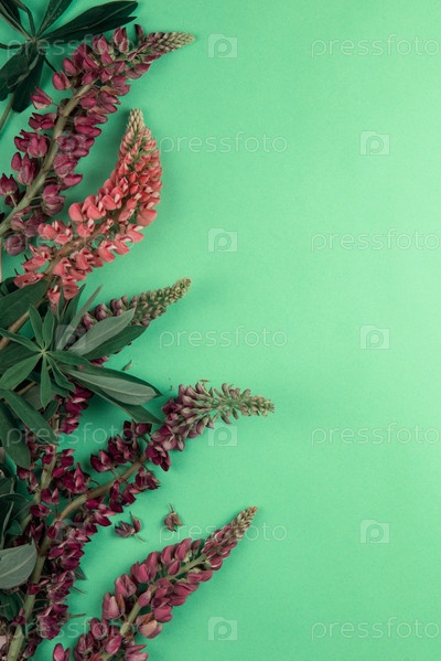 Макет текста на зеленой бумаге с декором из цветка люпина