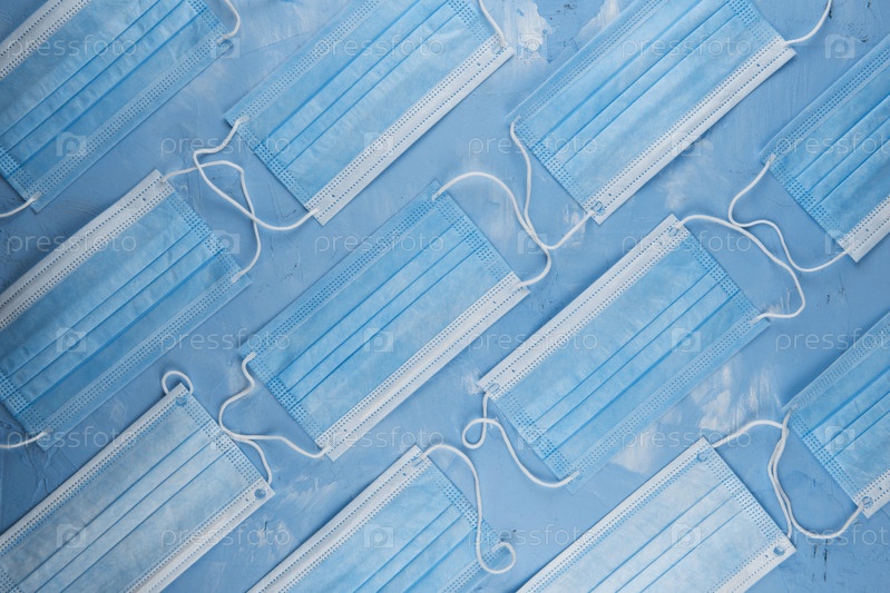 Медицинские маски на синем фоне для защиты от коронавируса. Концепция эпидемии и здравоохранения, узор, плоская планировка