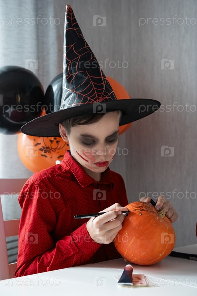 Счастливый подросток в костюме готовится к празднованию Хэллоуина, рисуя тыкву. Концепция карнавала или маскарада на Хэллоуин