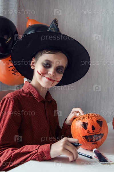 Счастливый подросток в костюме готовится к празднованию Хэллоуина, рисуя тыкву. Концепция карнавала или маскарада на Хэллоуин