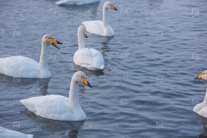 Красивые белые лебеди-кликуны плавают в незамерзающем зимнем озере. Место зимовки лебедей, Алтай, Сибирь, Россия