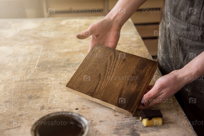 Плотник красит деревянную доску в деревянной мастерской. Профессия, плотницкое дело и столярное дело